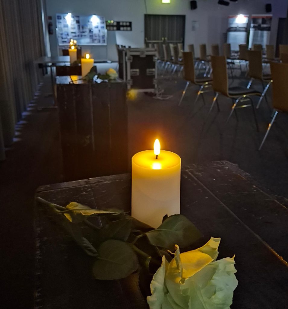 Den ganzen Tag über konnten Klassen und Kurse ab dem Jahrgang 7 mit ihren Lehrkräften in die Aula kommen. Auch in den Pausen kamen Schülerinnen und Schüler aus eigenem Interesse, um die Erinnerung an den Holocaust wachzuhalten und sich mit der Frage zu befassen, was wir alle tun können und müssen, damit sich solche Verbrechen gegen die Menschlichkeit heute und in Zukunft nicht wiederholen. Ein besonderer Dank gilt den Schülerinnen und Schülern der diesjährigen Auschwitzkurse, die halfen, diesen Ort den ganzen Schultag über zu betreuen.